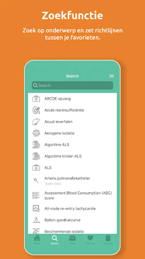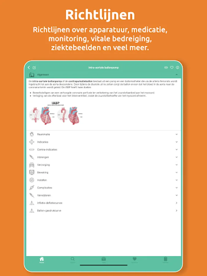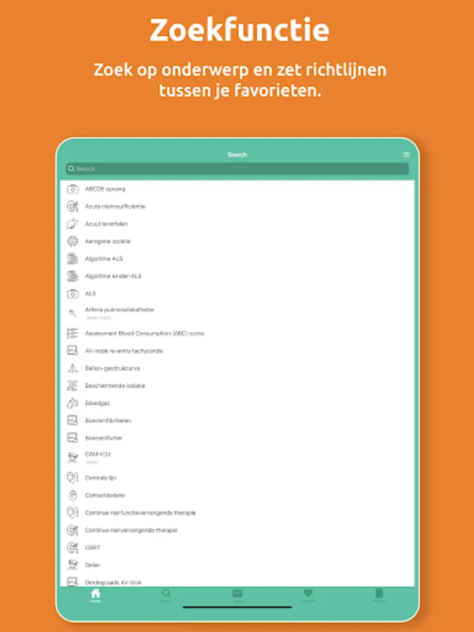 The IC nursing app is intended for IC nurses (in training), but can also be used by other healthcare providers involved in the care of patients in the Intensive Care Unit (IC). The app contains practical information, interpretations of guidelines, including interactive flow charts and handy calculators, which can also be saved as a 'favourite'. In addition, the users themselves can add personal notes.