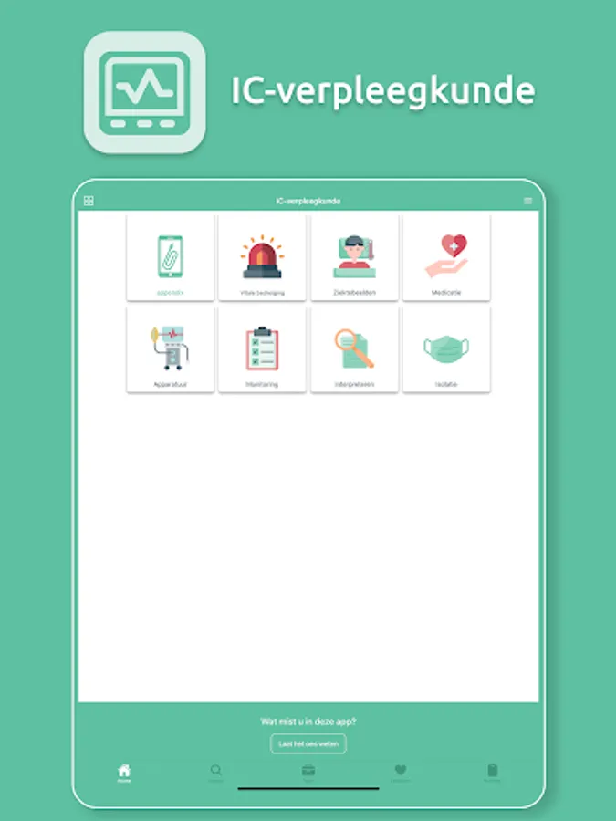 The 'IC nursing' app should only be used by nurses, medical specialists, physician assistants, physiotherapists, interns and medical students, whether or not in training. The app is not intended to be used by patients. Patients are advised to always consult a doctor in case of complaints.