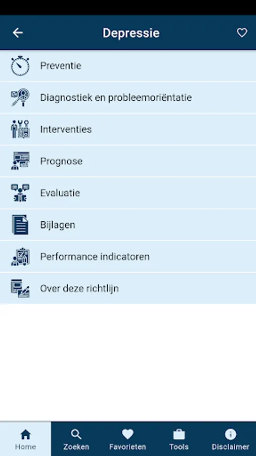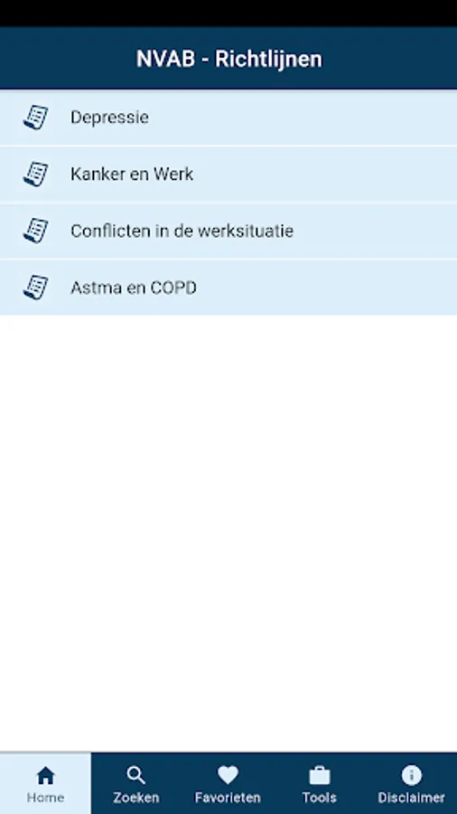 This app of the Dutch Association for Occupational and Occupational Medicine (NVAB) consists of 5 guidelines to date. Namely 'Depression', 'Cancer and Work', 'Conflicts in the Work Situation', 'Asthma and COPD' and 'Psychological Problems'.