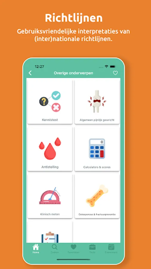 The 'Orthopaedics' app is intended for all healthcare providers involved in the care of patients within orthopedics and related specialties, including sports medicine and physiotherapy. This app contains interpretations of guidelines, including interactive flow charts and handy calculators, which can also be saved as a 'favorite'.