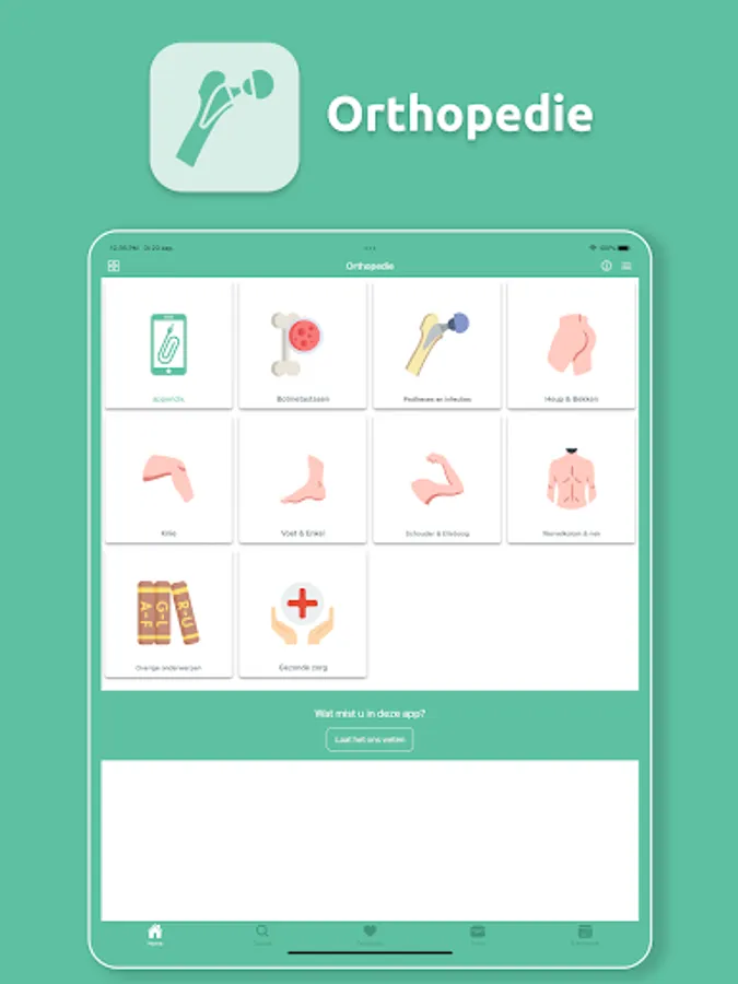 The 'Orthopaedics' app should only be used by medical specialists, physician assistants, physiotherapists, interns and medical students. The app offers a clear overview of interpretations of various guidelines in the field of Orthopedics. The app is not intended to be used by patients. Patients are advised to always consult a doctor in case of complaints.