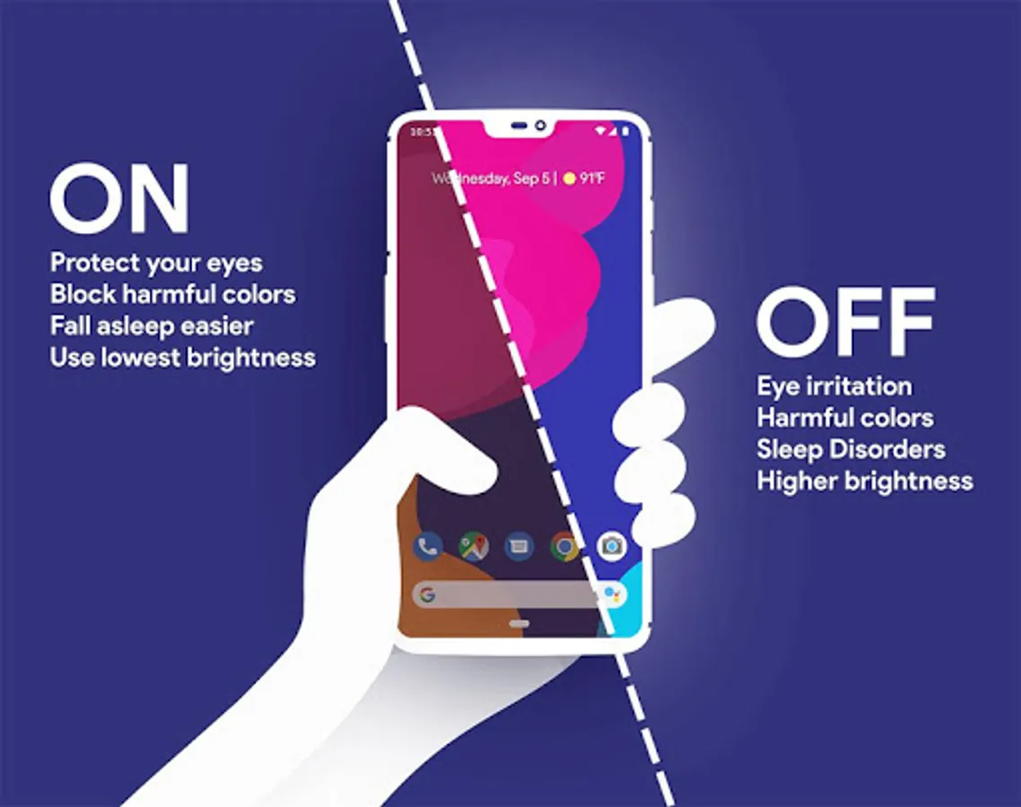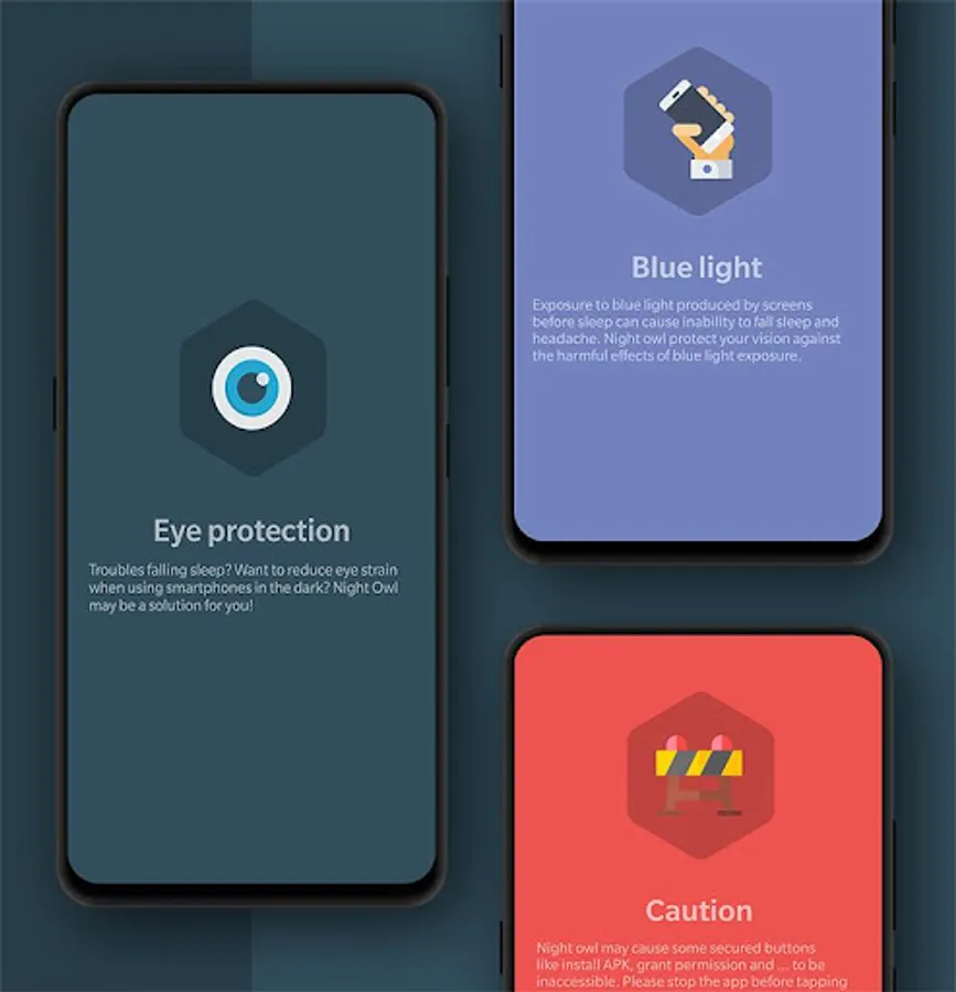 Night Owl filters out blue light and reduces the brightness of your phone's screen more than you can achieve with Android settings, which helps you avoid eye strain, insomnia (inability to sleep), and headaches when staring at your phone in the dark.