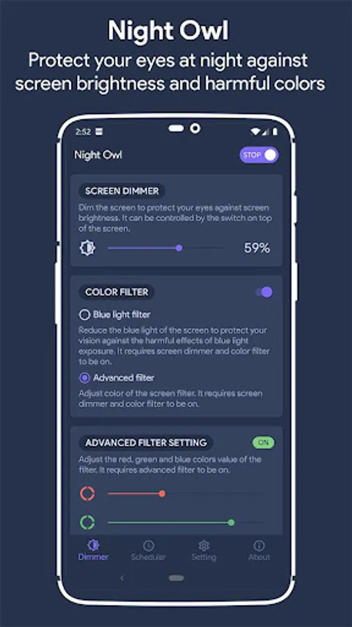 Do your eyes feel tired when you read on your phone at night? Do you have trouble falling asleep after looking at your phone's screen for a long time? Night Owl might be the solution for you!