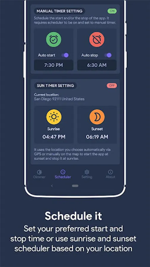 • Schedule the app to start and stop automatically via timer or sun scheduler.