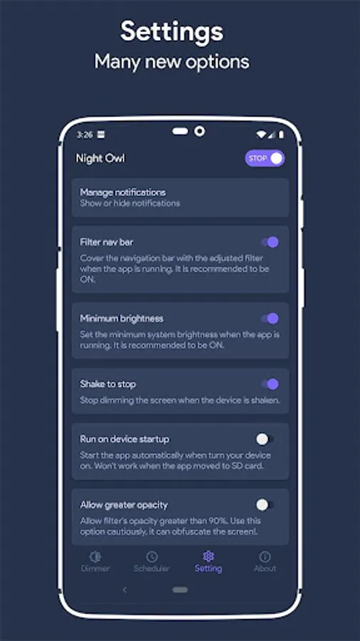 Beta feature: Night Owl uses Android's accessibility feature to display a tinted overlay over the screen (including notification and lock screen) to make it darker than usual and/or change its color. Night owl does not read your screen content and does not collect any data through the Accessibility service. You need to enable Night Owl Accessibility to use the app.