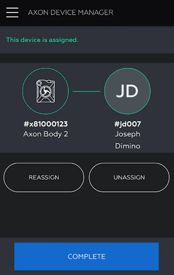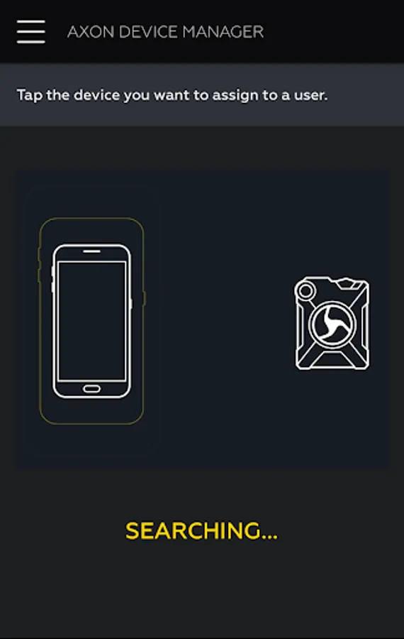 Axon Device Manager simplifies this process to seconds per camera. With the app running, the armorer taps the back of the Android device to an Axon Body 2 camera and receives the device type and serial number. The armorer then searches for and selects an Evidence.com user, and assignment is complete.
