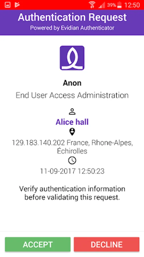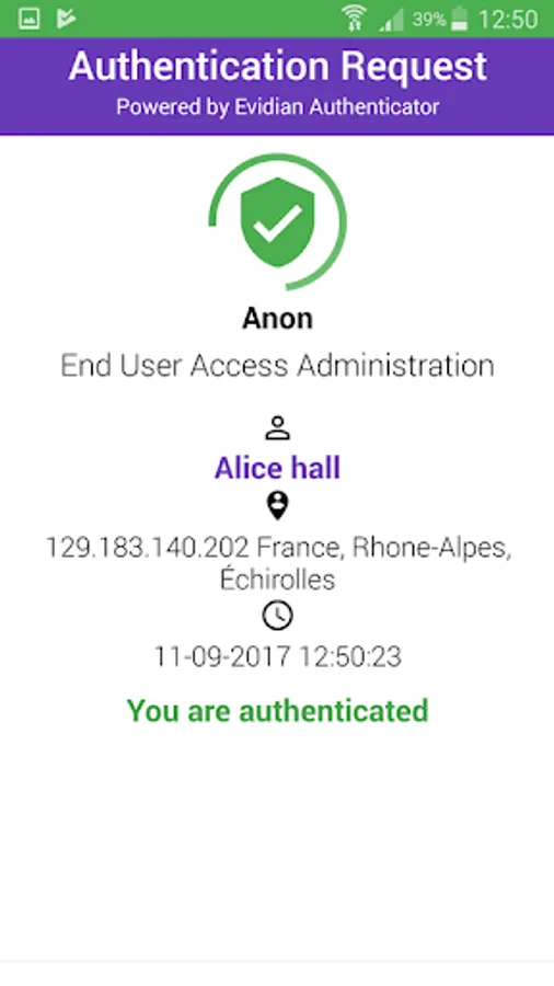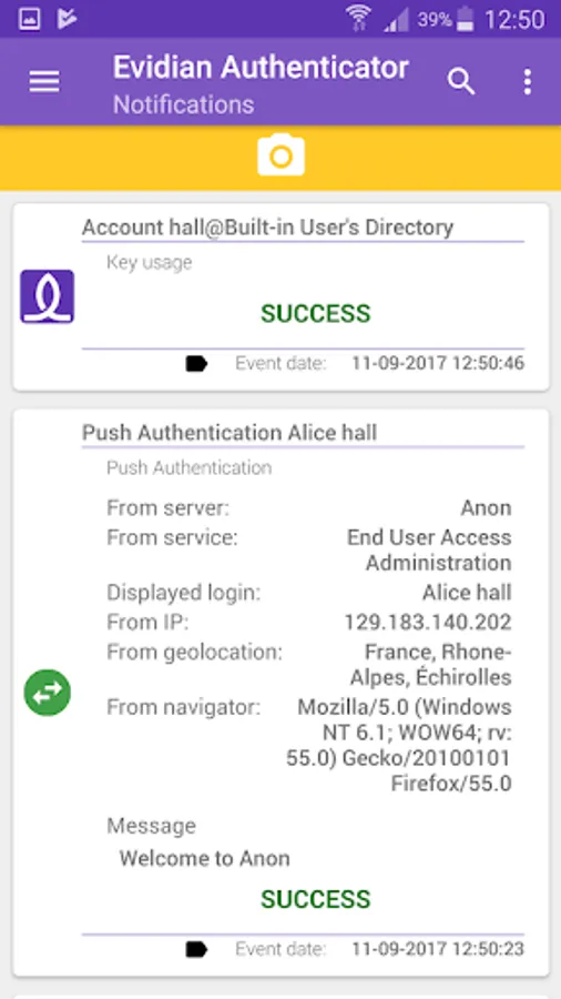 When used with Evidian Web Access Manager, any modification of the user’s profile in WAM will generate a confirmation notification in Evidian Authenticator (GDPR). All accounts or key usages are tracked and kept in the history of Evidian Authenticator.