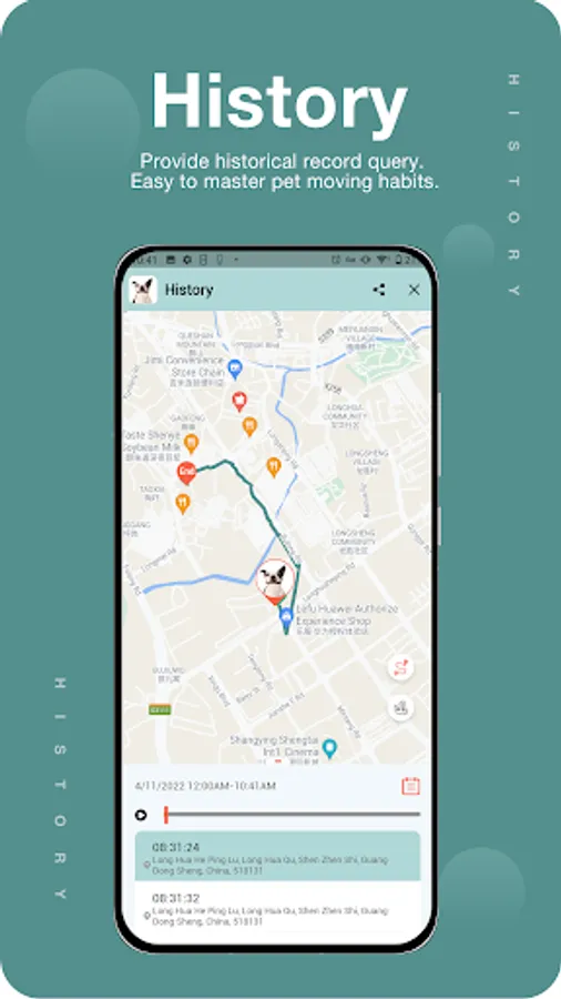 It's time to take a review of his trip! Being displayed as the video of movement on the map, historical data allows you to check the places your furry friend has gone to.
