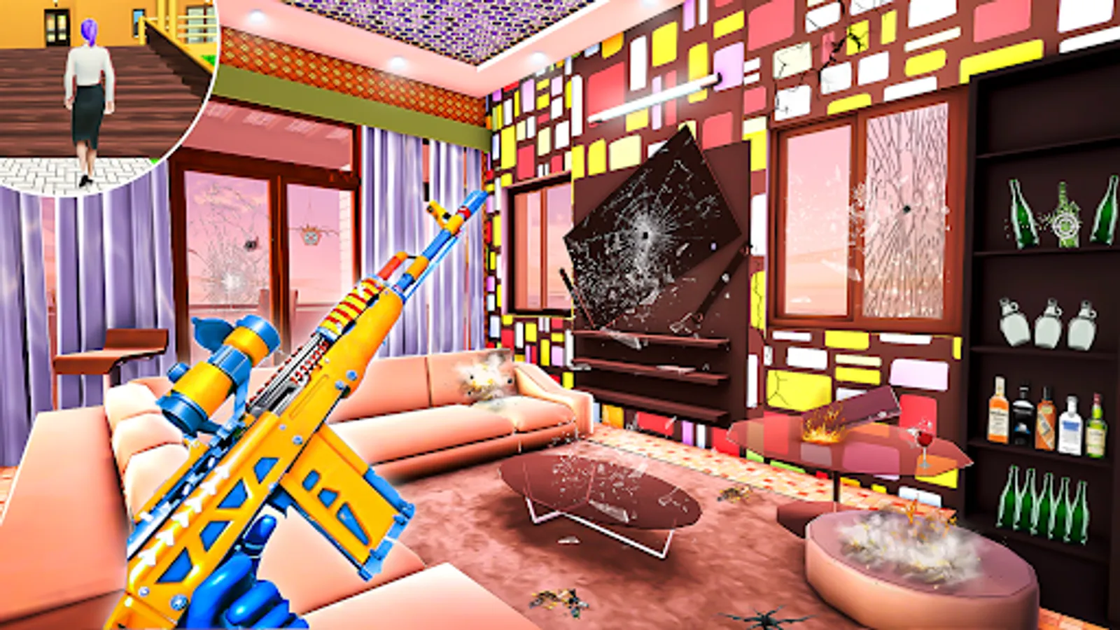 Enter the evil teacher's house & tear her house interior, performing different tasks like shooting and destroying her mansion stuff. In this home demolition game, your goal is to smash the creepy teacher house interiors with shooting guns. This destroy house game lets you smash interiors with guns, the scary house has televisions, laptops, tables, utensils, mirrors, furniture, and other home stuff, etc. so you can use different weapons, like M191 pistol, M416 Gun, Ak47, pistol to smash everything and cause destruction in the evil teacher house in this mind relaxing game. This fps shooting skills game is the best opportunity to take revenge teacher by smashing her room interiors and enjoying the destruction effects! Destroy all the green signed objects before the evil teacher comes and catches you.