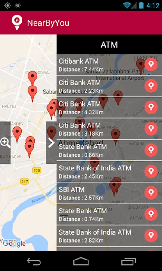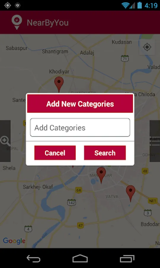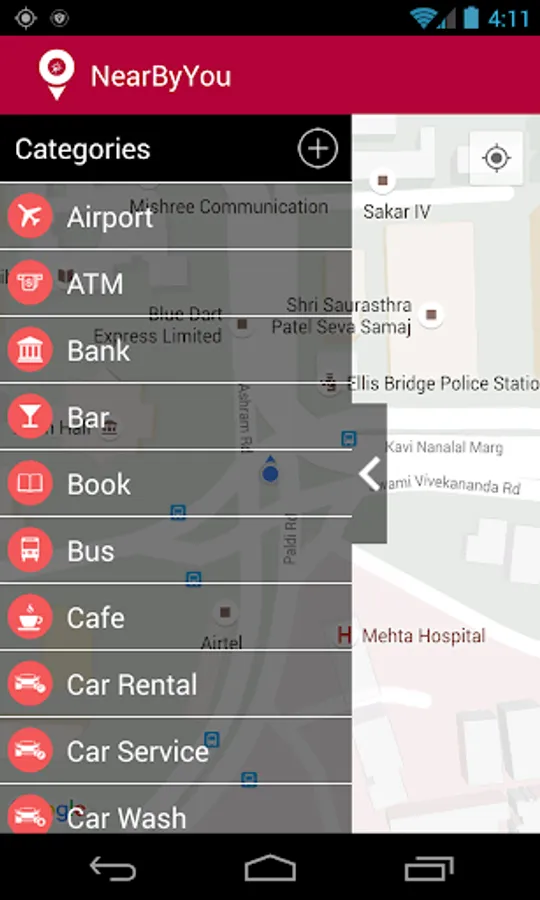 NearByYou quickly identifies your current location and allows you to search the nearest Bank, Bar, Petrol Station, Hospital, Hotel, Movie Theatre, Restaurant, Supermarket, Theatre and Taxi. Also you can add your own custom categories to search and it will save in your search categories list for future purpose.