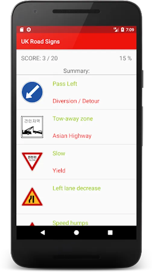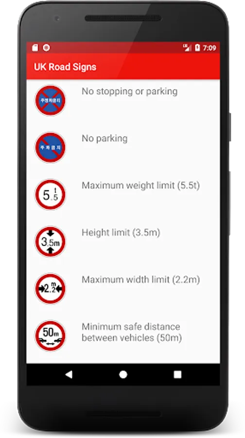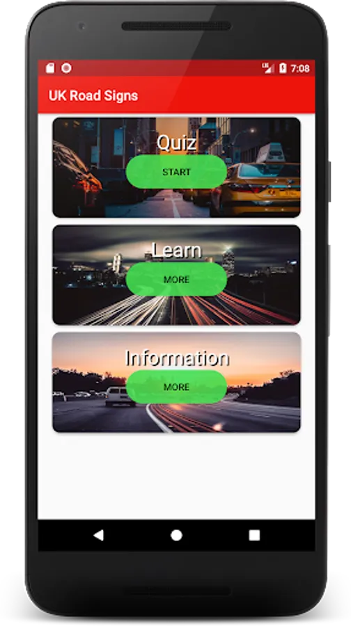 This app contains both a quiz where you can test your knowledge, as well as a list of all the different traffics signs with image and exlanation. Perfect to use if your studying for a test, or just want to learn the different road signs.