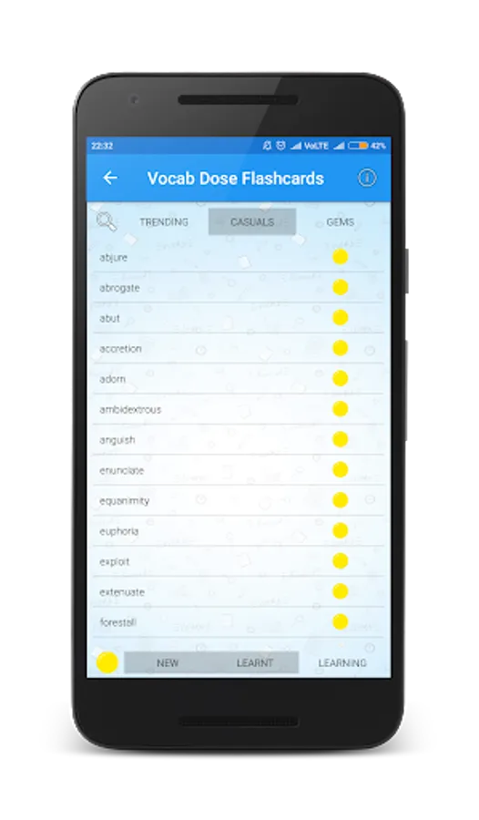 -Customized learning: Decide whether to learn words from trending, casuals or gems category. Choose among new words, learnt words (to revise) and words you are currently learning and might not remember completely. Mark words and decide whether to learn from only marked words or the complete word list.