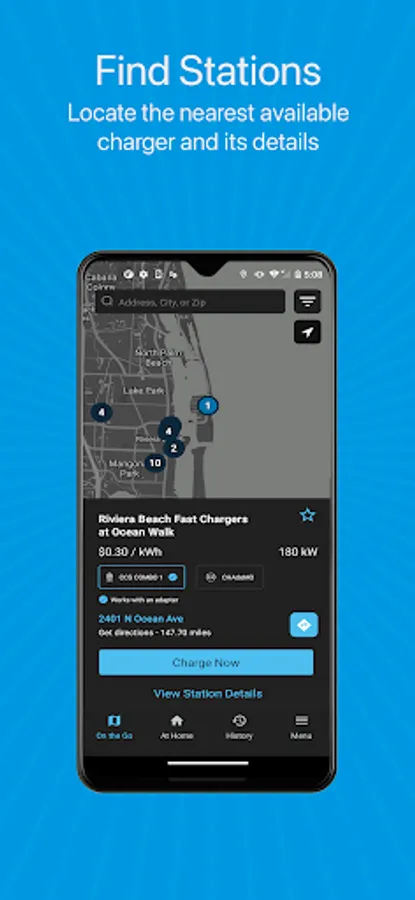 Find a Place to Charge: Locate charging stations nearby and get rerouted to the selected station.