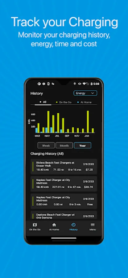 Create a user profile: See your charging history and trends, including miles added and cost.