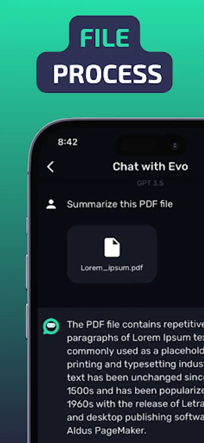 File Recognition: Upload documents and let Evo provide insights, summaries, and much more.