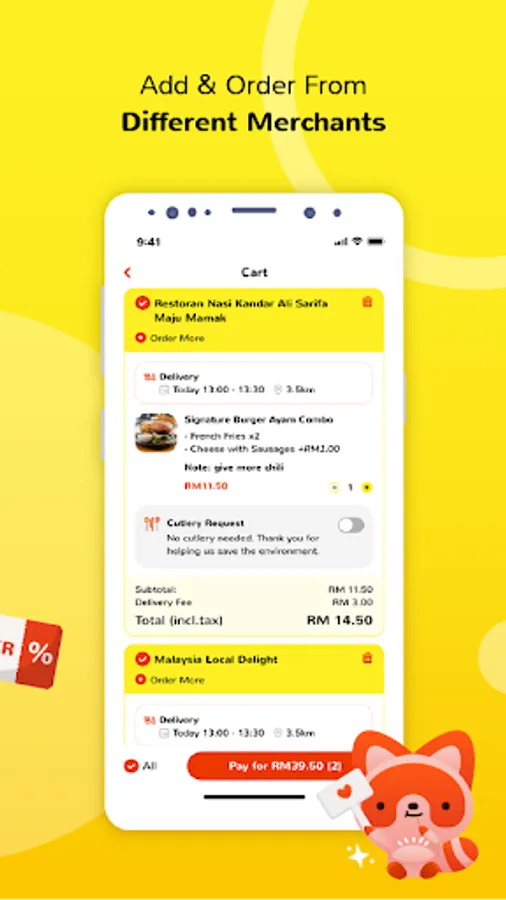 Add your favourite food from different merchants to your cart and pay all at one tap.