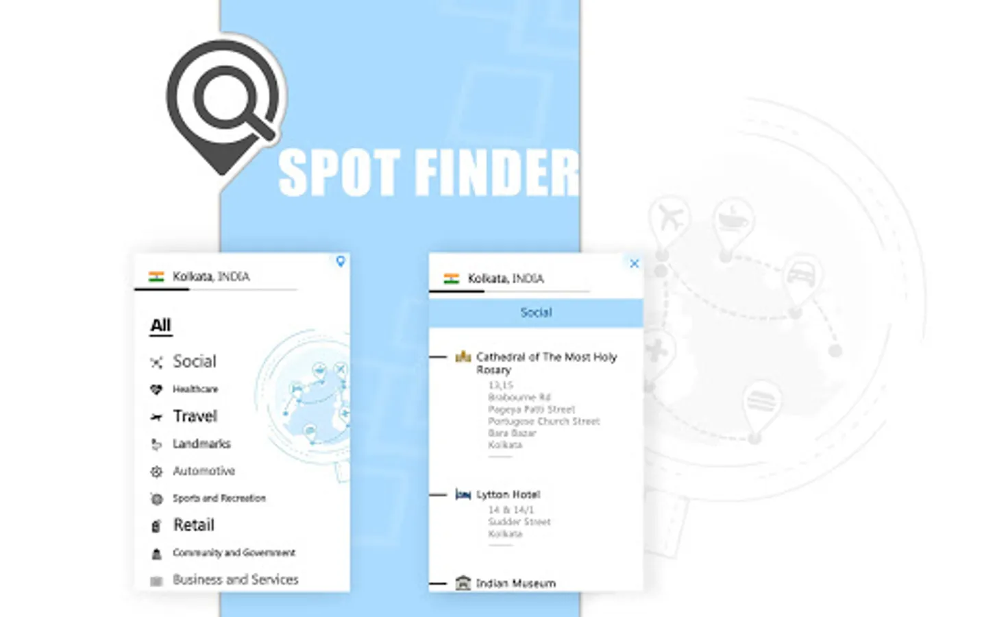 6. Spot Finder: We have added broad categories of places of social, educational, healthcare, retail interest, automation & business, ATMs etc. city wise. You will also find top rated places you are searching for.