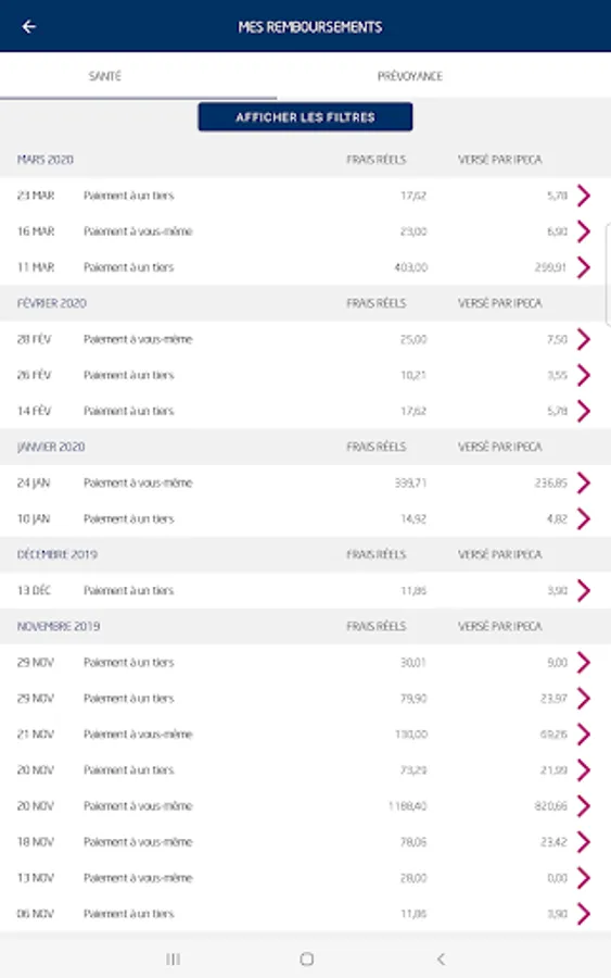 You can track the history and nature of your healthcare and pension reimbursements in real time. You have the possibility to filter by type of care, by date of care, by date of reimbursement or even by beneficiary.