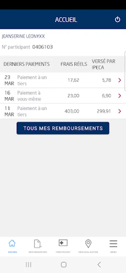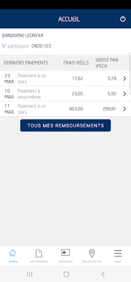 At a glance, you can view your latest reimbursements and directly access all of the application's sections.