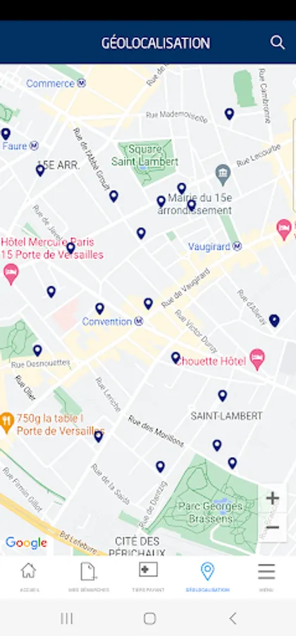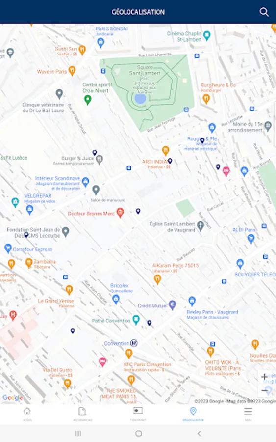 Geolocation allows you to view on a map the location of healthcare professionals (by specialty) registered in our repository, near your current position or from a manually entered address.