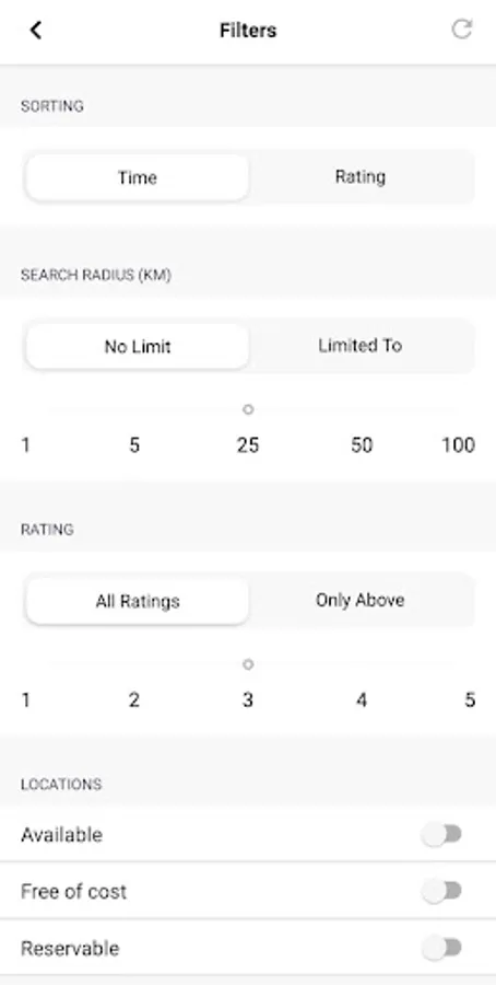 Filter out charging locations based on distance, rating, connector type, location availability/free of cost/reservable, and amenities.