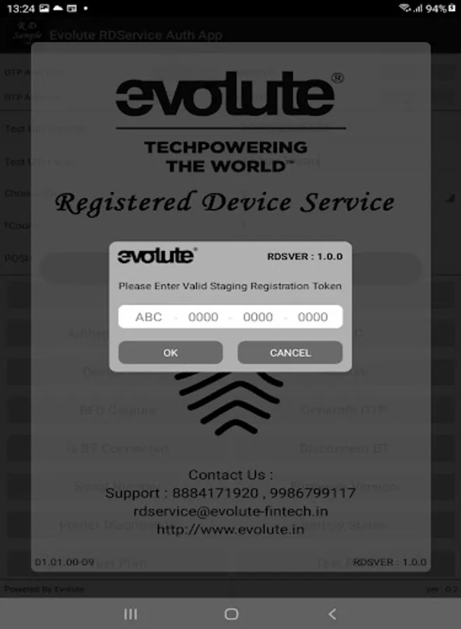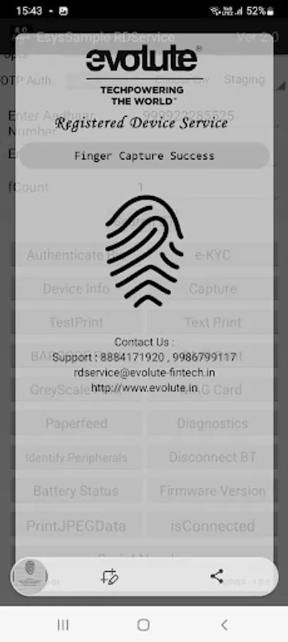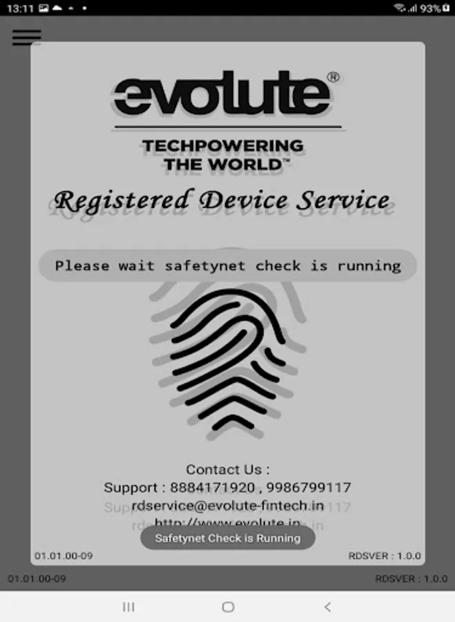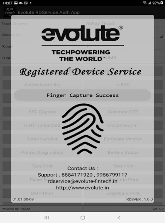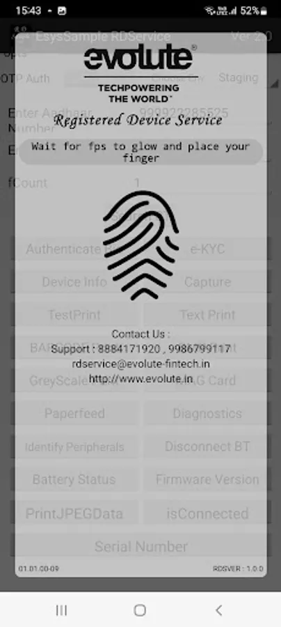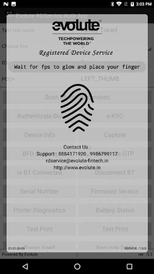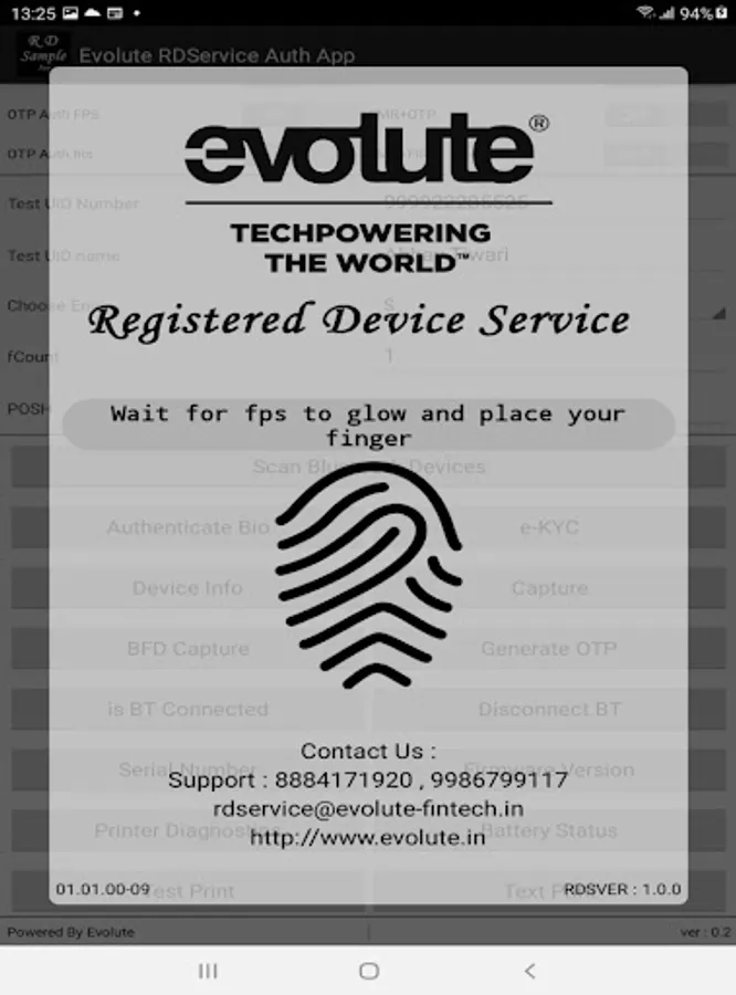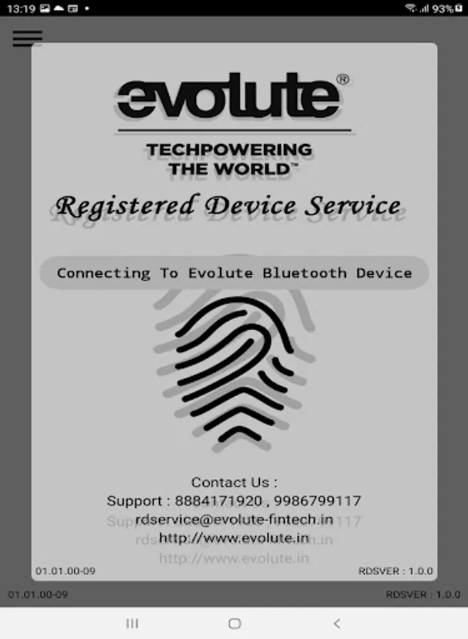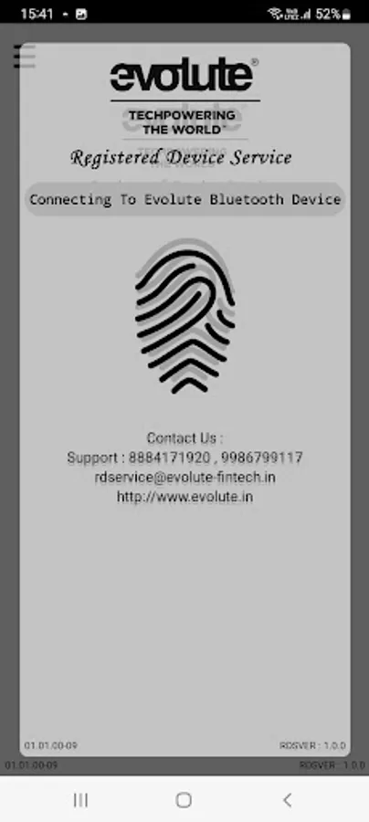 This is Registered Device Service (L0) for Evolute Devices with Fingerprint Scanner for devices LEOPARD, FALCON and IDENTI5 provided by Evolute Systems Pvt Ltd. This application is required to use device with AADHAAR authentication. This application captures Fingerprint as per UIDAI guidelines for Aadhar Authentication and eKYC. RD Services for our devices enable your solutions and end users to validate their Fingerprint devices with UIDAI with the help of our Management Server. For registering the Finger print device with UIDAI, you shall require to be in possession of at least one unit of EVOLUTE device. By launching the application and connecting the device, RD services shall complete the necessary processes for registering your device with the UIDAI. RD Service is STQC certified as per UIDAI Registered Device Specification-V2.0.1. Devices are designed for the most ease use while finger placement. Devices are made to withstand large amounts of shock even free fall from as per fall test. In case of any error, you shall be given the appropriate error message with which you can approach our help desk as given below on any working day during office hours.