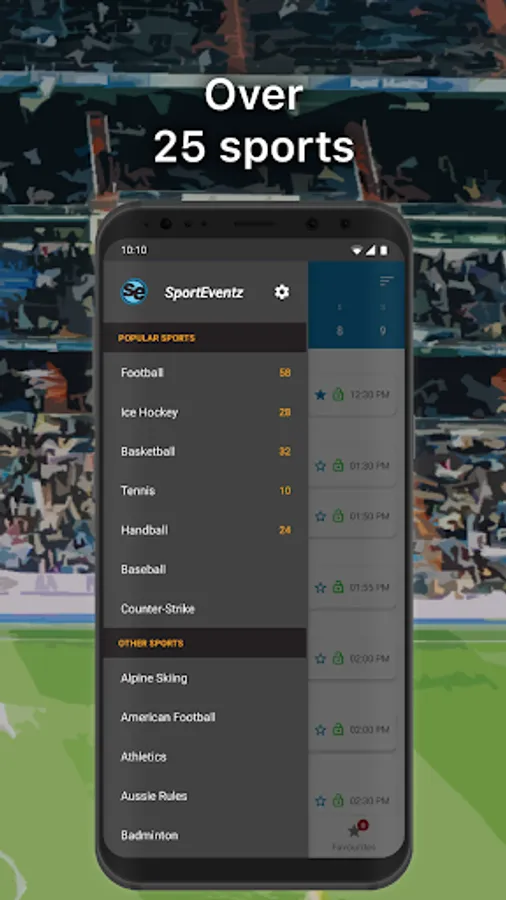 Sports: Football, Basketball, Tennis, Volleyball, Handball, Ice Hockey, Snooker, Boxing, Baseball, E-Sports, American Football, Athletics, Aussie Rules, Badminton, Bandy, Beach Soccer, Beach Volleyball, Cricket, Curling, Cycling, Darts, Field Hockey, Floorball, Futsal, Gaelic Sports, Golf, MMA, Motorsport, Rugby, Ski Alpin, Squash, Tabletennis, Waterpolo and Winter Sports.