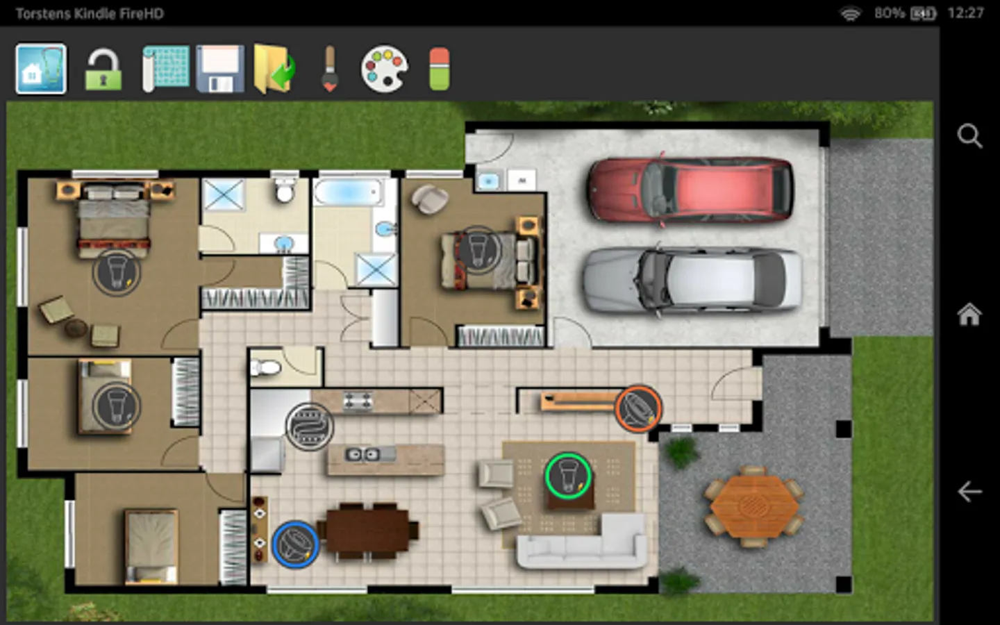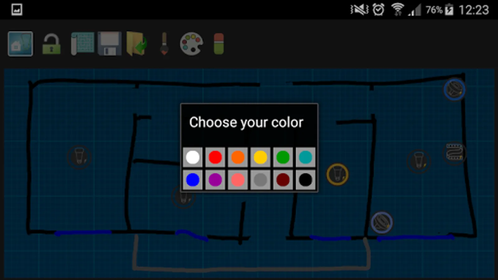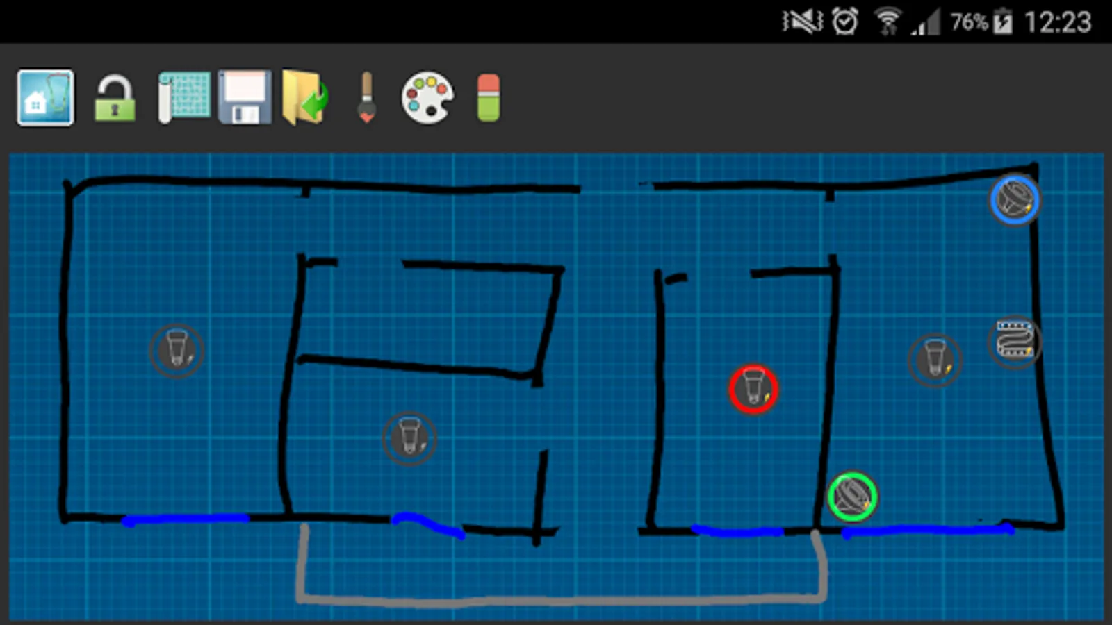 Create a layout either simply with your fingers by painting on the screen in different colors, or with your computer using a professional application for the design of a house. Save the layout as an image and load it into the hueHome app as background. So with that, you have a professional smart home control center!