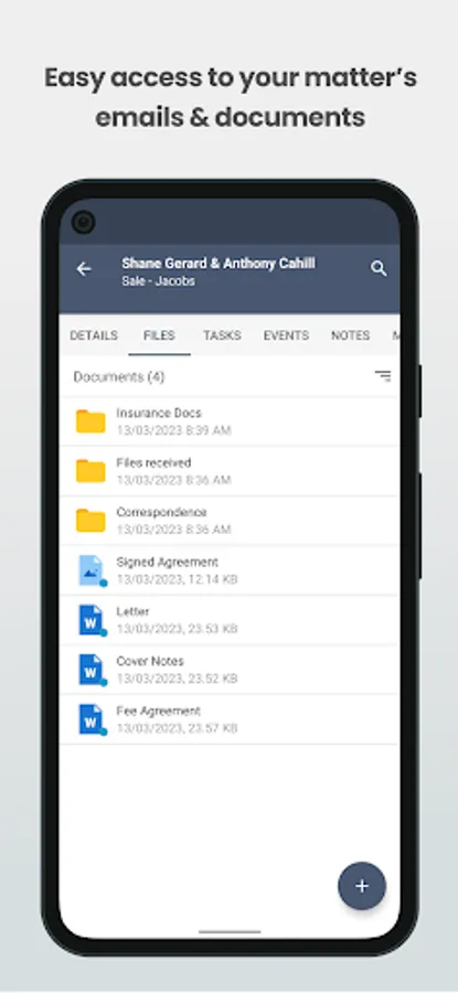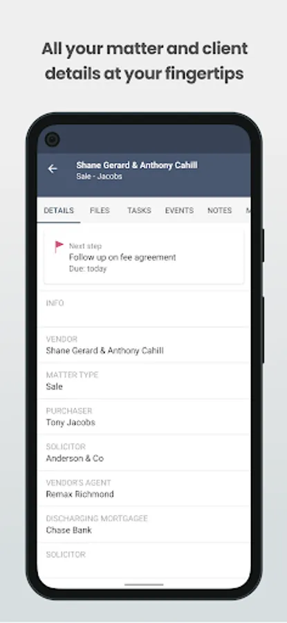 View the pertinent details, parties, emails, documents, events and tasks for each matter.