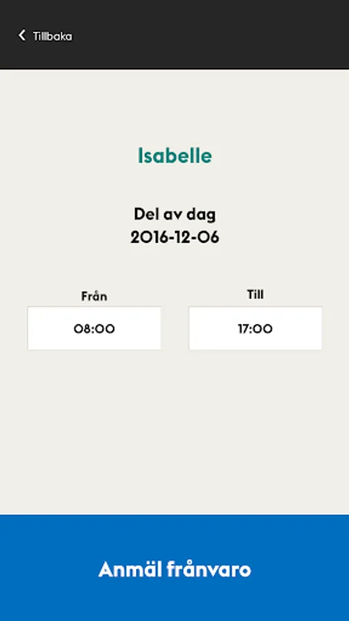 With a few clicks, you register as guardians full day or part of day when your child is absent. The app then generates your application in the form of an SMS sent to Stockholm's school website.