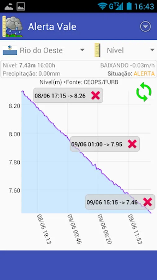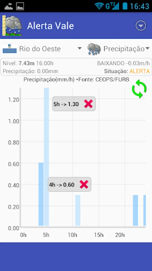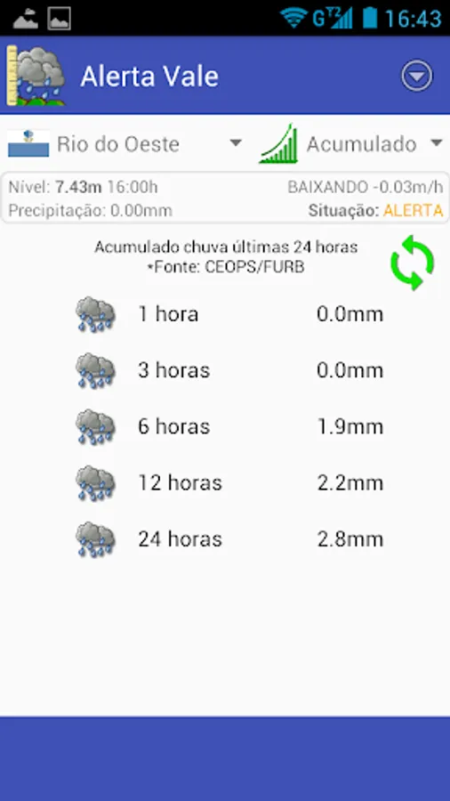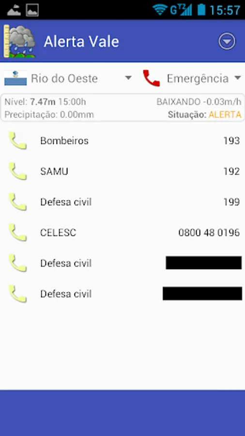 Worried about rains, storms and floods? AlertaVale allows you to monitor in real time the rainfall (rainfall) and the level of rivers in the Itajaí Valley - Santa Catarina. Alert Vale uses data from the CEOPS / FURB, which monitors the level of rivers in real time. In addition, Vale Alert shows the current trend of rivers (whether they are rising, falling, or stable) and also the current situation / state (normal, alert, attention, or emergency).