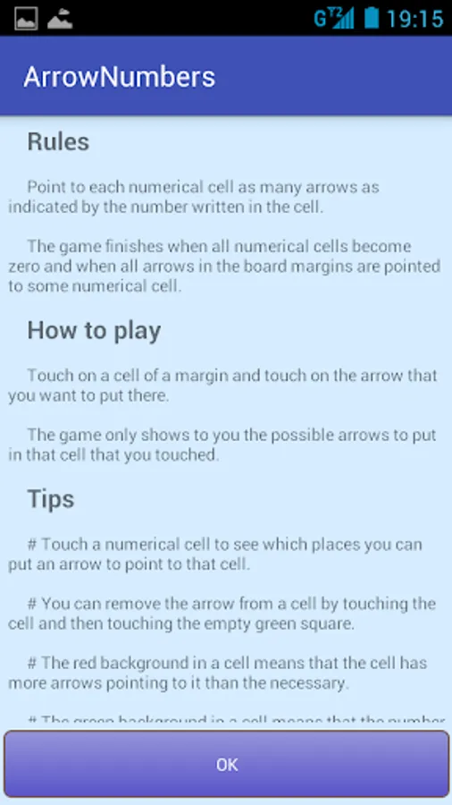 Arrow numbers is a fun brain game puzzle that uses a lot of your brain, logic, creativity, and reasoning to solve it. It is similar to Sudoku, and you need to point to each numerical cell as many arrows as indicated by the number written in the cell. The puzzle finishes when all numerical cells become zero and when all arrows in the board margins are pointed to some numerical cell. Moreover, you can select the level that you want to play. Arrow numbers provides 7 different levels, from easy to hard.
