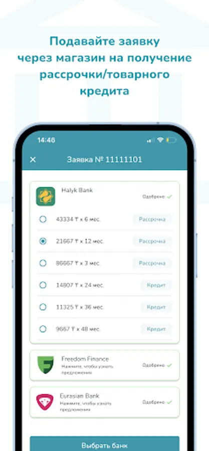 In the application, you can apply for an installment loan, a commodity loan at several banks at the same time and choose the most advantageous offer for you. And also find the address of the nearest store to you.