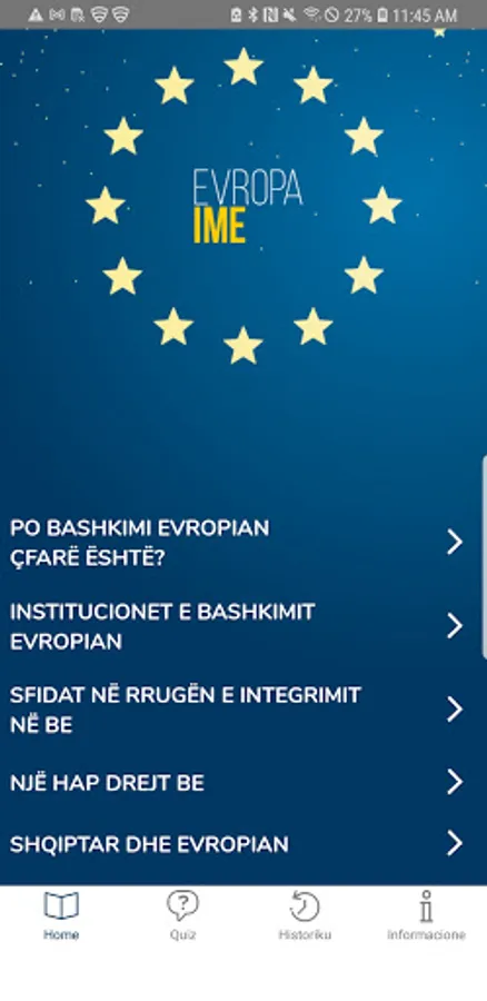 This application was prepared within the project "My Europe", implemented by the European Center and supported by the Konrad Adenauer Foundation, Office for Albania. The purpose of this application aims to raise awareness among Albanian youth through an innovative way about the European Union, its main institutions and the Albanian negotiation process.