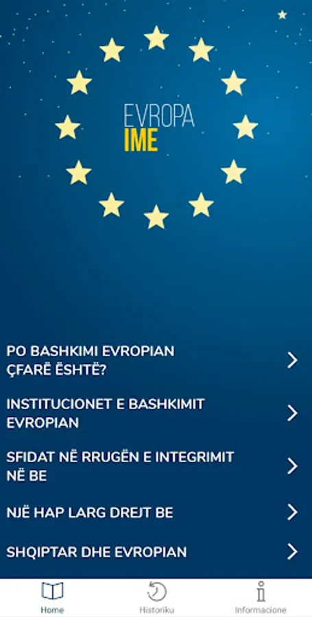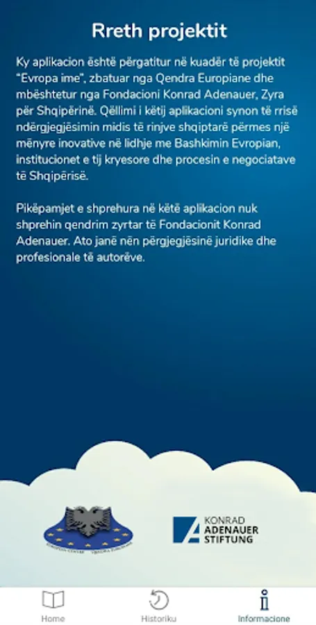 This application has been prepared within the project "My Europe", implemented by the European Center and supported by the Konrad Adenauer Foundation, Office for Albania. The purpose of this application aims to raise awareness among Albanian youth through an innovative approach regarding the European Union, its main institutions and the negotiation process of Albania.