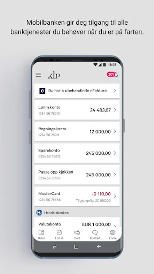 With the mobile bank from KLP, you get quick access to the same services you find in the online bank. You easily check the balance and how much you have left over before the next salary. In addition, you can transfer money, make payments, approve eFaktura, check the due list and latest movements - and everything else you do in the online bank. You will receive notifications about, for example, new eInvoices, stopped payments and messages from the bank, as well as tips and information tailored to you.
