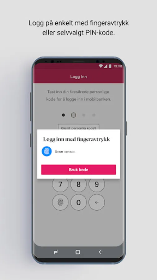 Once you have downloaded the app, you must identify yourself. You can identify yourself with BankID, BankID on your mobile or code chip from KLP Banken. You select a personal 4-digit code during activation. We recommend that you create a different code than the one you use to unlock the phone. The code is used for login and payment. If your phone supports fingerprint reading, you can choose to use it instead of 4-digit code.