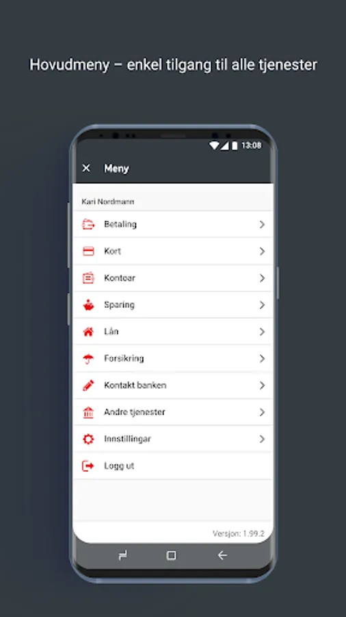 By selecting "Go to online banking" from the main menu, you get access to the same functionality and menu as in the online bank. Some pages in the online bank are not customizable for mobile yet, work is being done on improvement.