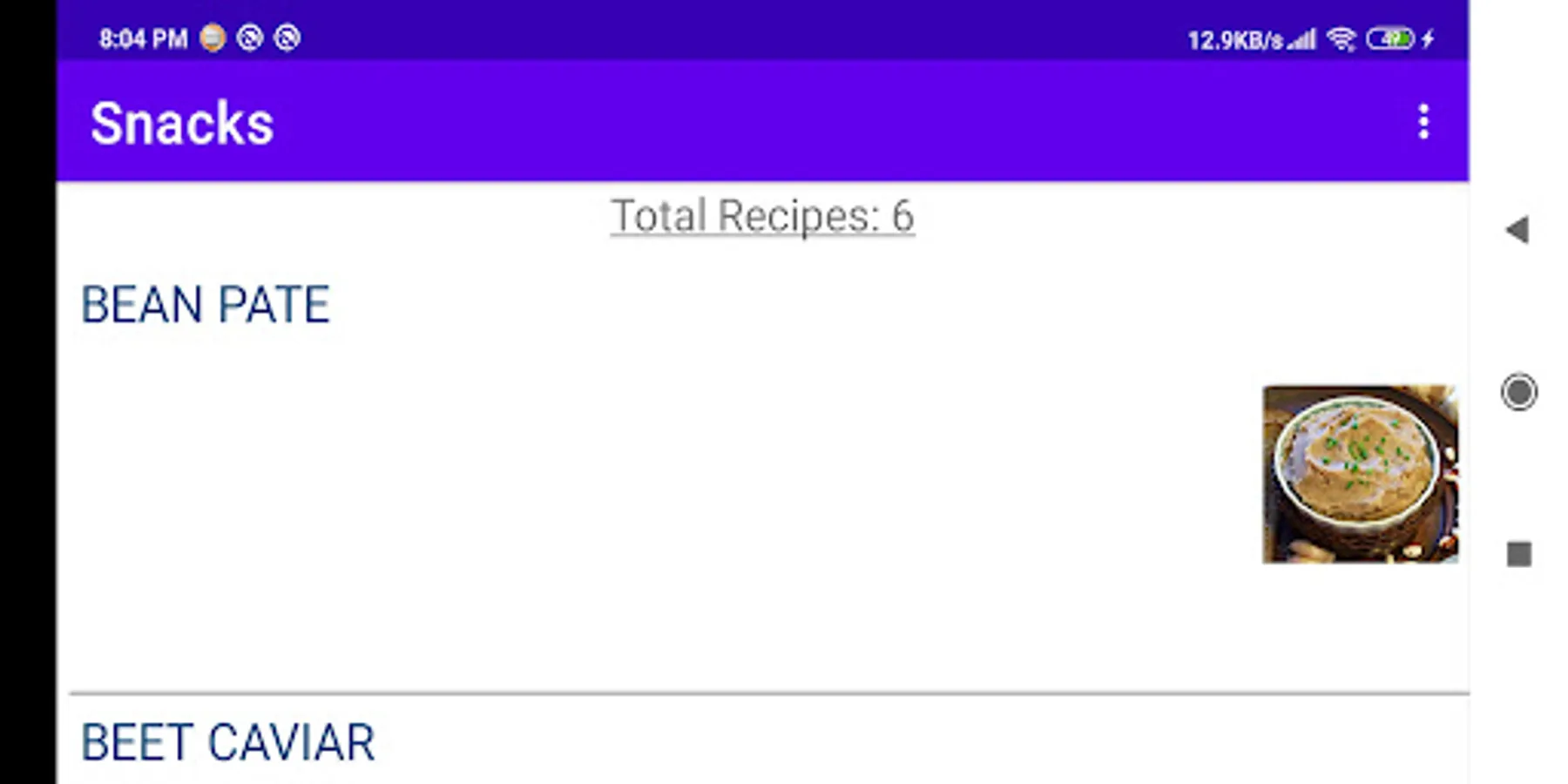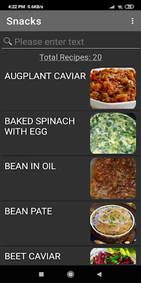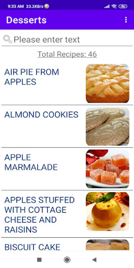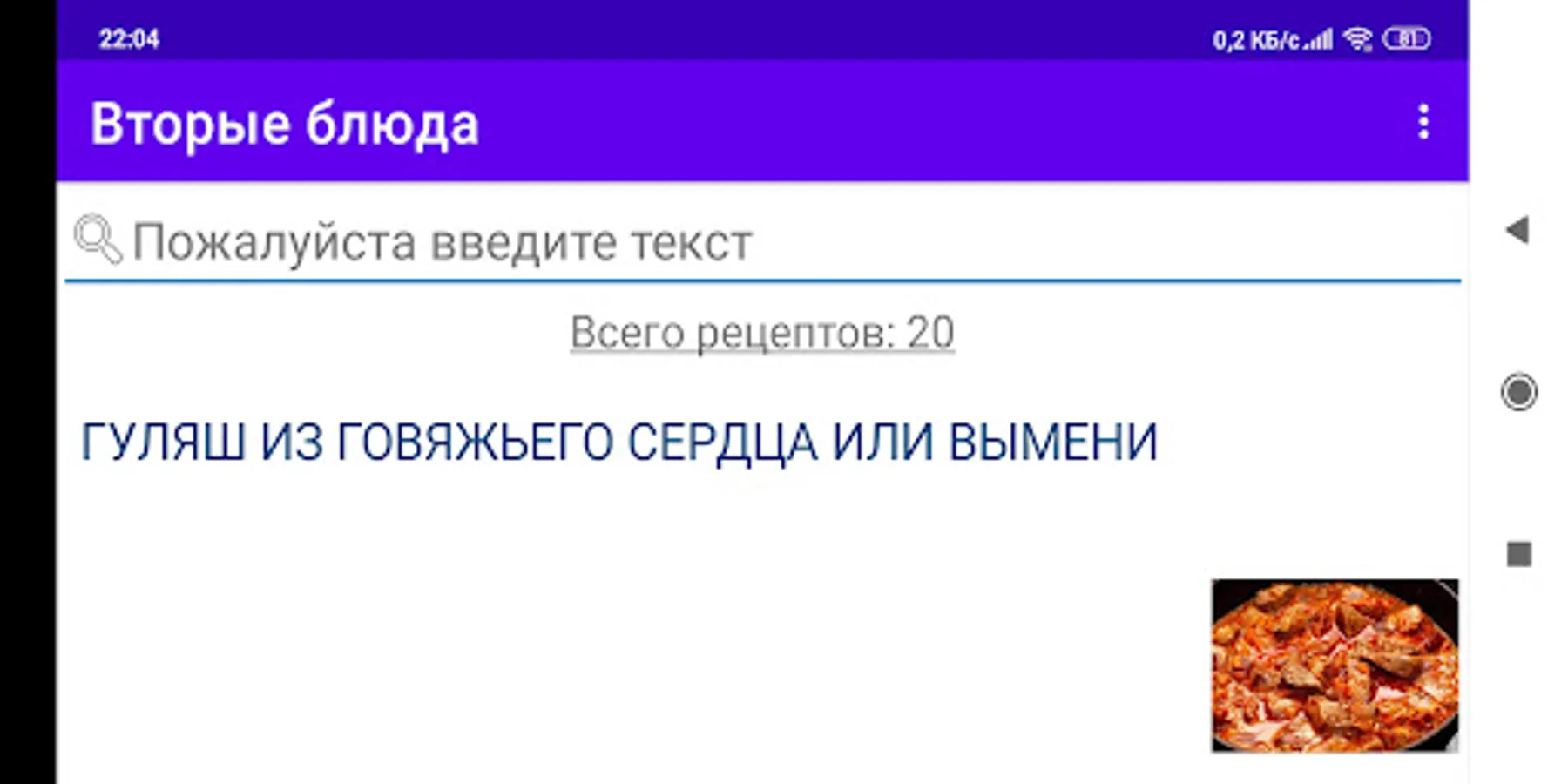 The application contains various cooking recipes with a photo of the dish, cooking instructions and a list of ingredients. The number of recipes is constantly updated online.