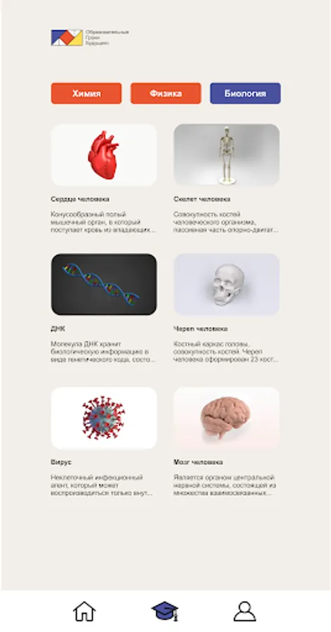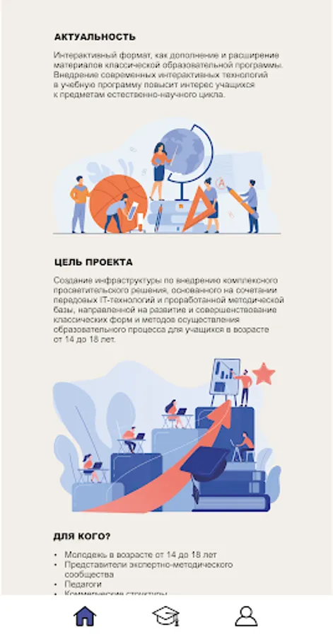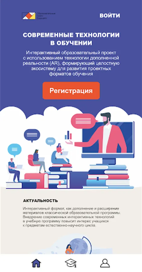 "Educational Faces of the Future" is an interactive educational project using augmented reality (AR) technology, which forms an integral ecosystem for the development of interactive learning formats. The project is aimed at providing students with new opportunities in the study of school disciplines, primarily the natural science cycle (physics, chemistry and biology). The interactive format of the educational course will complement and expand the materials of the classical educational program. This application is aimed at creating an infrastructure for the implementation of a comprehensive educational solution based on a combination of advanced IT technologies and a well-developed methodological base aimed at developing and improving the classical forms and methods of implementing the educational process for students.