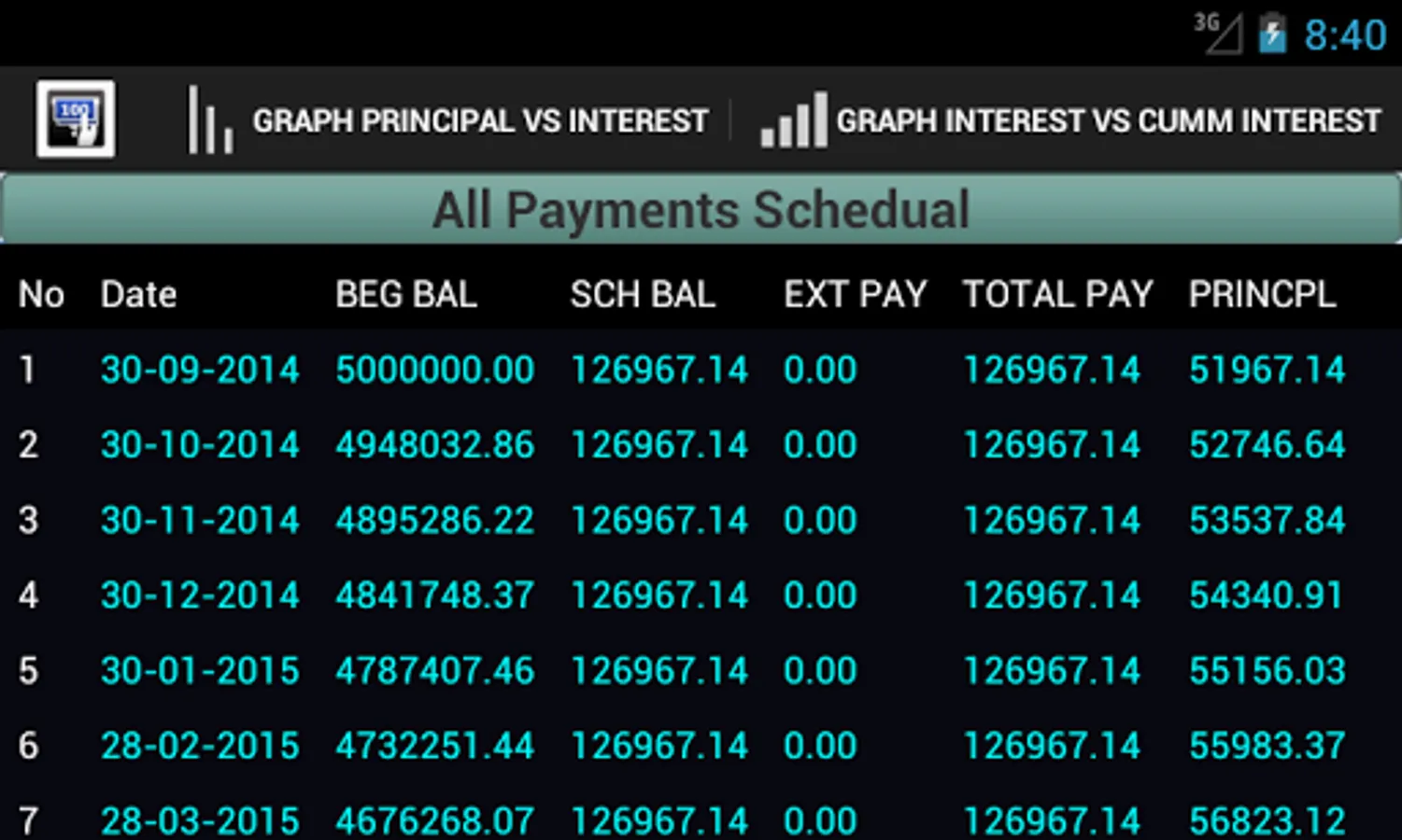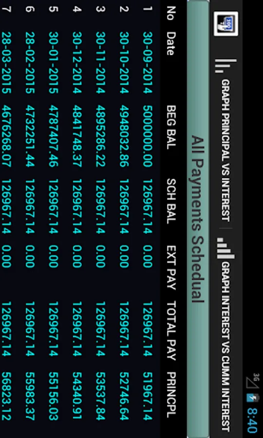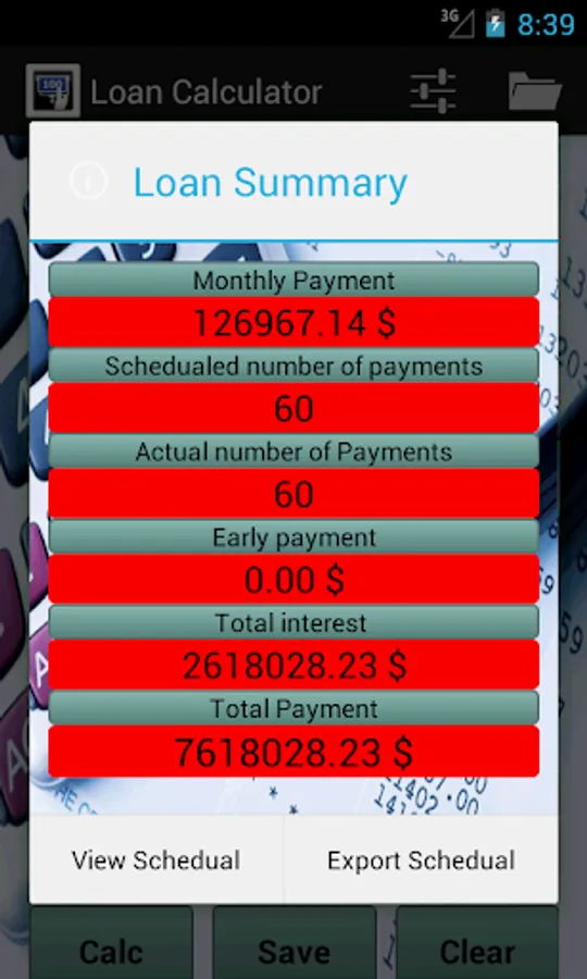 Also the app will provide an amortization schedule including graphs of the life time of your loan. You will be able to export the schedule in excel format for viewing and printing on a PC.