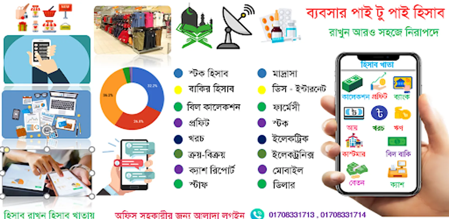 হিসাবখাতা- কিস্তিতে পণ্য বিক্রয়ের হিসাব রাখার জন্য খুব সুন্দর একটি অ্যাপ। খুব সহজে কিস্তি ব্যবস্থাপনা করা যায়। বাকির কাস্টমারকে এসএমএস দিয়ে নোটিফিকেশন করা যাচ্ছে। স্টক - হিসাব রাখার জন্য ভালো মানের একটি অ্যাপ।। সমস্ত ধরনের ব্যবসায়ের গ্রাহকদের অ্যাকাউন্ট রক্ষণাবেক্ষণের জন্য এটি সম্পূর্ণ নিরাপদ এবং সুরক্ষিত একটি অ্যাপ। দোকান মালিকরা তাদের বিশ্বস্ত গ্রাহকদের জন্য বাকি এবং নগদ লেনদেনের রেকর্ড রাখতে পারবেন অ্যাপটির মাধ্যমে।