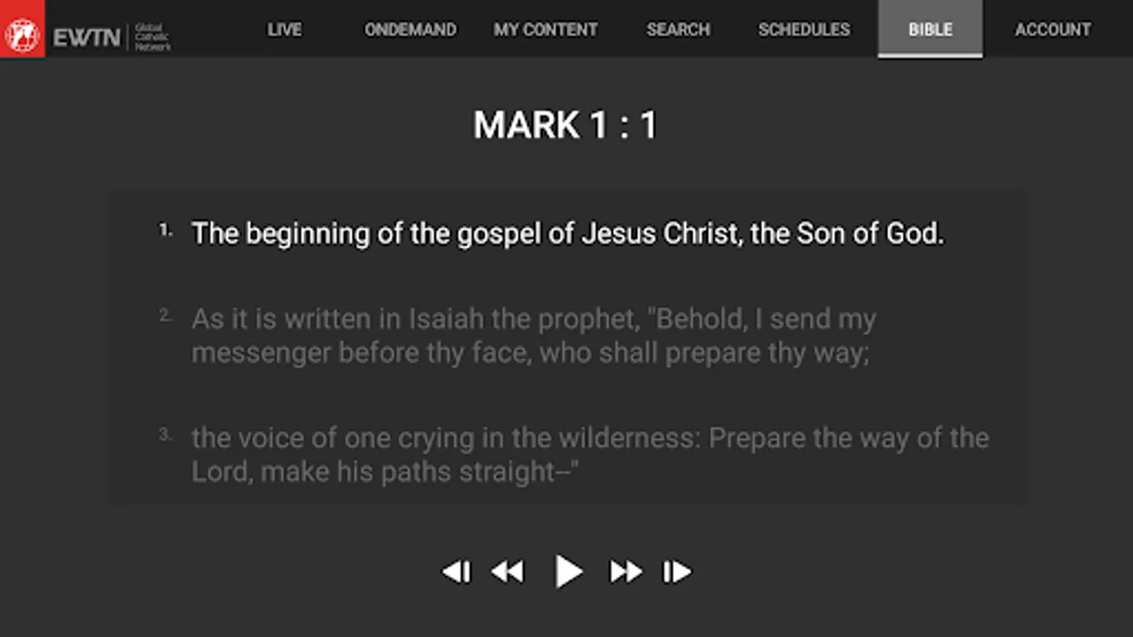 FREE: RSV-Bible text with entire Gospel of Mark audio (99 minutes) featuring Blair Underwood as Mark - plus full text of the RSV-CE Bible and access to EWTN Live content. At anytime you can purchase the complete New Testament audio.