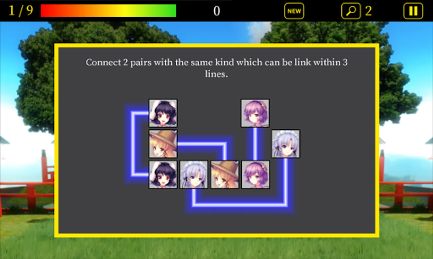 Connect the pairs with the same character which can be link within 3 lines.