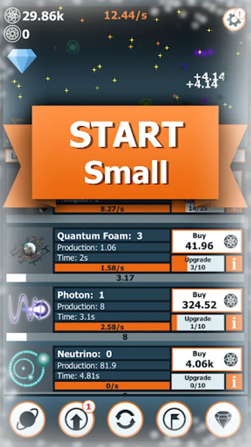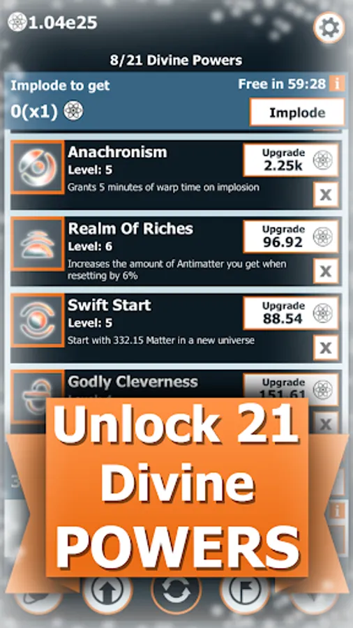 • Get even bigger with prestige! Every time you restart the game, you will obtain Antimatter, which can be used to buy permanent super powers!