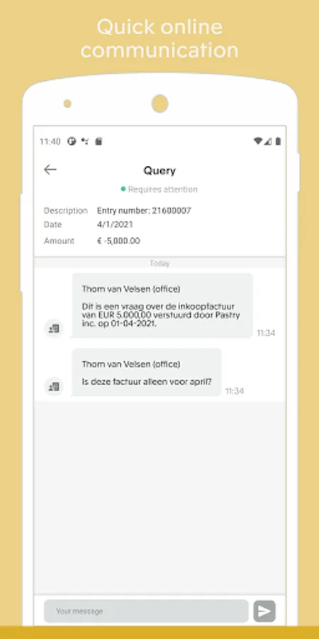 The Exact My[Firm] app gives you all the tools you need to run your business efficiently. You can communicate and exchange documents with your accountant in real-time in a chat window, so your financial data is always up-to-date. You can also process all your financial transactions in the app (invoicing, VAT returns, payments, etc.), so you never miss a payment or a deadline.
