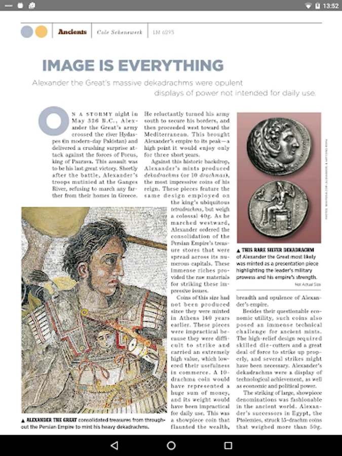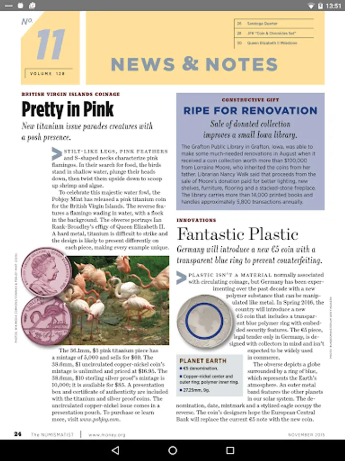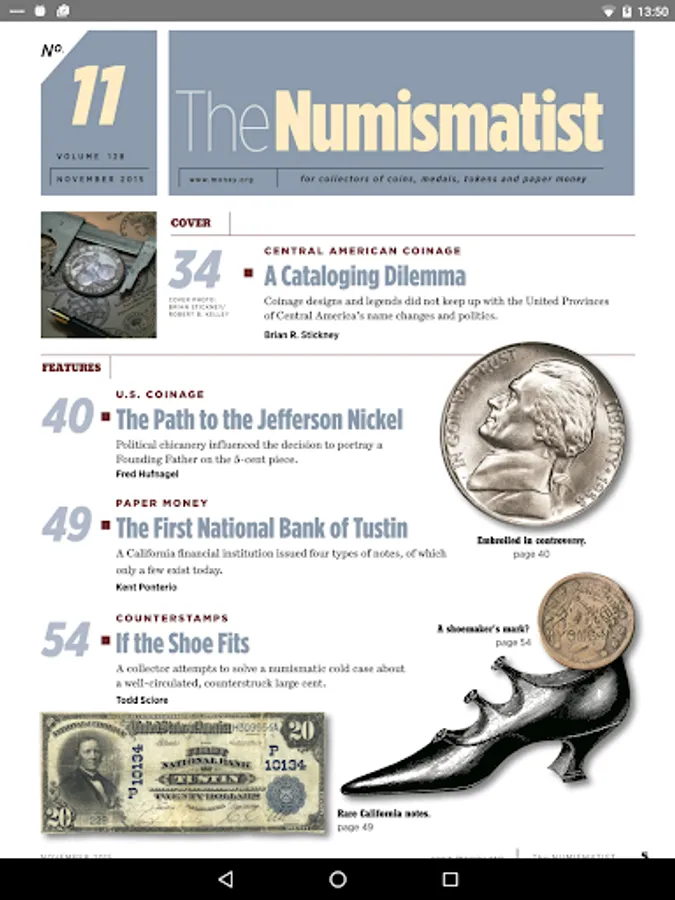 The Numismatist is a colorful, high-quality, educational magazine for collectors of coins, tokens, medals and paper money. Published since 1888 by the nonprofit American Numismatic Association (www.money.org), The Numismatist features 112-120 pages of informative, illustrated articles about the historical and entertaining aspects of numismatics; reports of hobby events and new coinage issues, including the U.S. Mint’s America the Beautiful Quarter Program and Presidential Dollar series and advertising by nationally respected coin dealers.