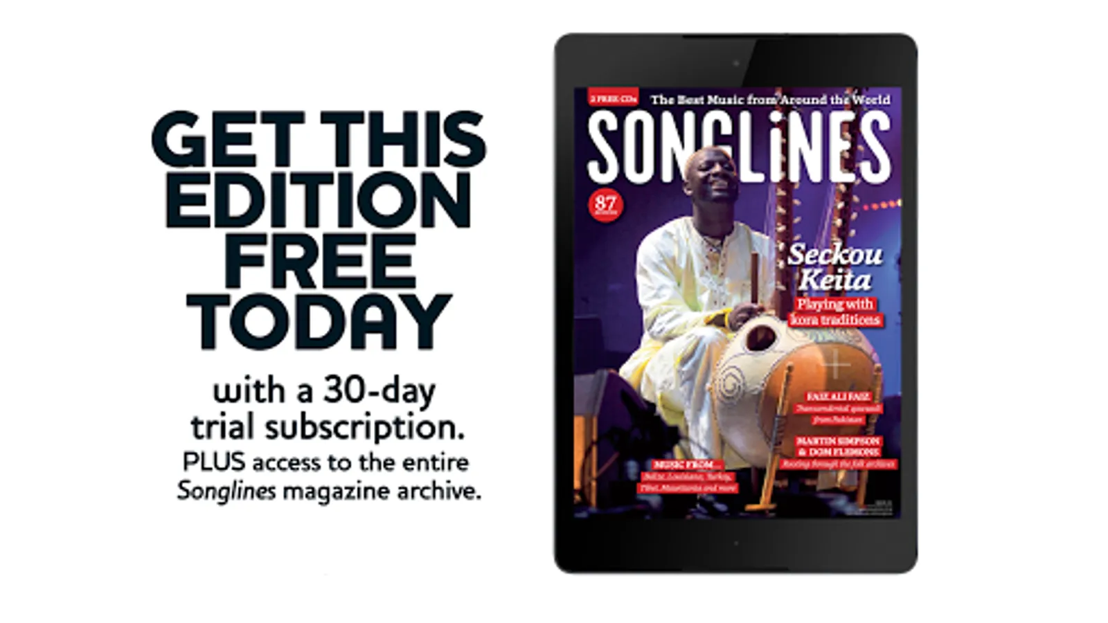 Download the free Songlines app today and take advantage of this amazing offer when you subscribe giving you access to the full archive from the very first issue. You’ll only be charged after the 30-day trial and can cancel your subscription anytime during this period.