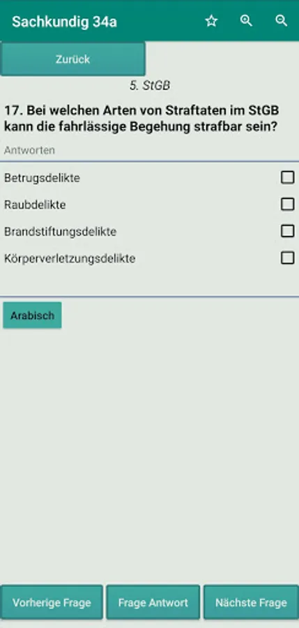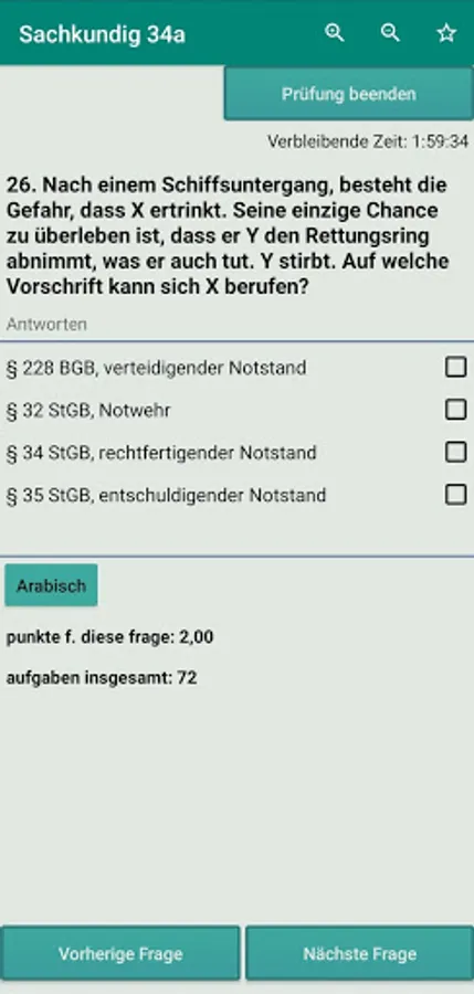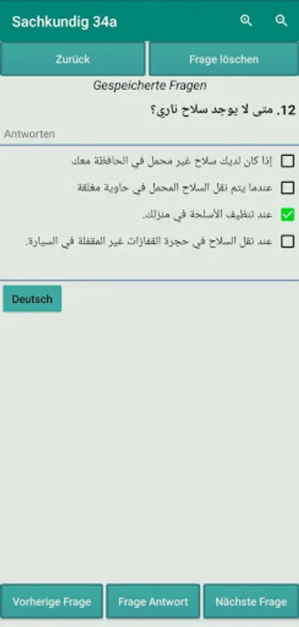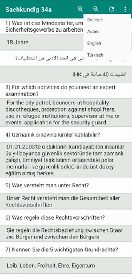 Lernmodus: In diesem Modus finden Sie 168 Fragen und Antworten, die Ihnen helfen, die mündlichen Prüfung zu gehören.Fragen Sind in vier sprachen ( Deutsch , Arabisch , Englisch , Türkisch ).