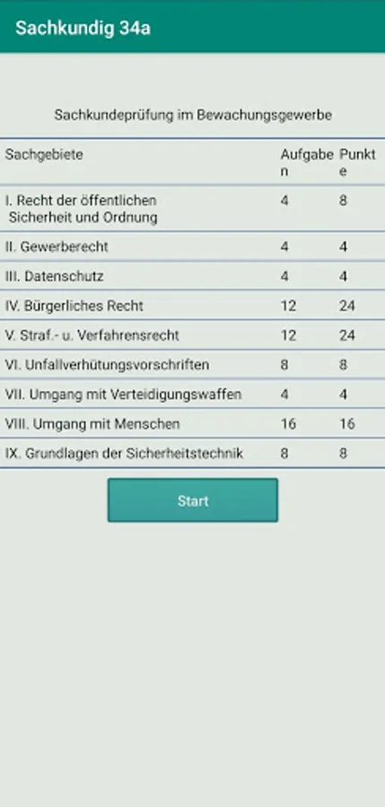 Gemäß der Bewachungsverordnung sind die Fragen in neun Sachgebiete unterteilt: